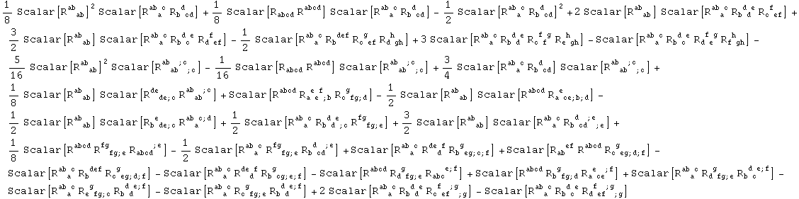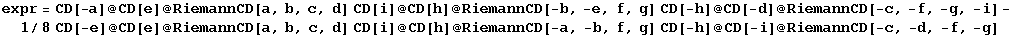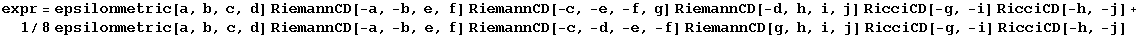 We can generate random Riemann invariants using the command RandomRiemannMonomial, having as argument the case (see Section 2), in this example {0,4}, meaning one Riemann with no derivatives and another with a fourth derivative: