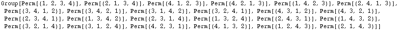 However we can describe the whole subgroup with just six permutations, corresponding to each rotation of the six faces of the cube. The subgroup can be constructed by repeated multiplication of the six "generators". We shall describe groups using generating sets, expressions with head GenSet where the elements are the generators. By convention, the identity permutation never belongs to a generating set. For example the group