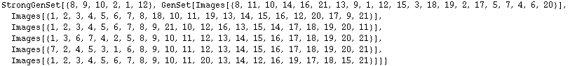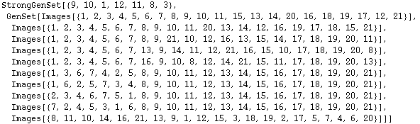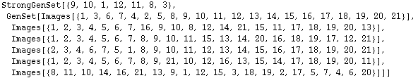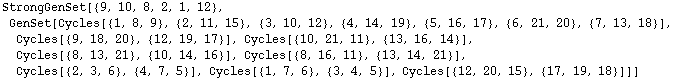 | StrongGenSet[{8,2,1,12},GenSet[Cycles[{8,16,11},{13,14,21}],Cycles[{2,3,6},{4,7,5}],Cycles[{1,7,6},{3,4,5}],Cycles[{12,20,15},{17,19,18}]]] |