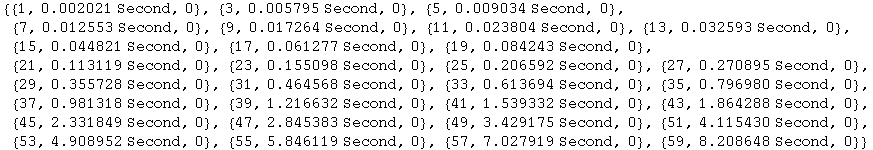 Let us see how the timings scale with the number of antisymmetric tensors. Evaluating this cell takes about a minute in a 1.8GHz Dual core processor. The executable xperm.linux requires here up to 30 Mbytes. Each computation is done only once, and that invariably introduces small deviations depending on which other tasks the computer is busy with.