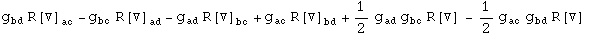 First we have some automatic contractions. These can be prevented with the option CurvatureRelations of DefCovD. By default, contractions of the Riemann tensor are automatically replaced by the Ricci tensor:
