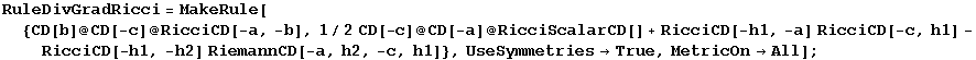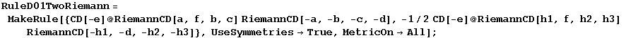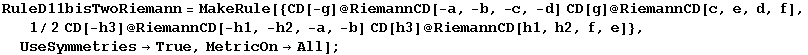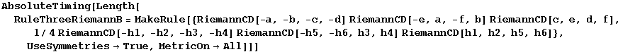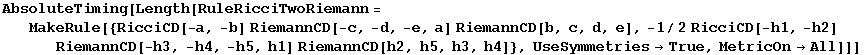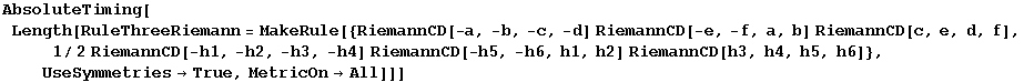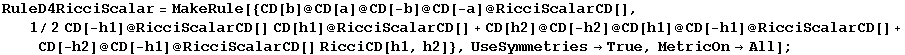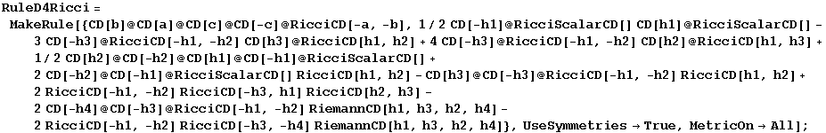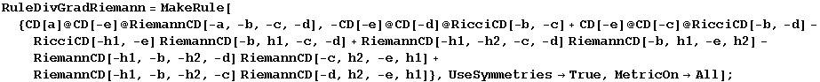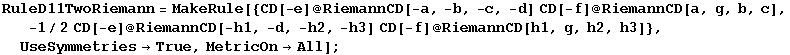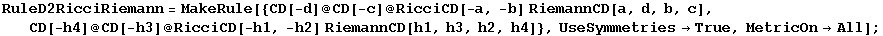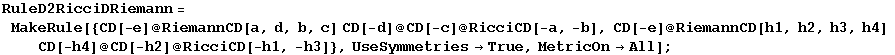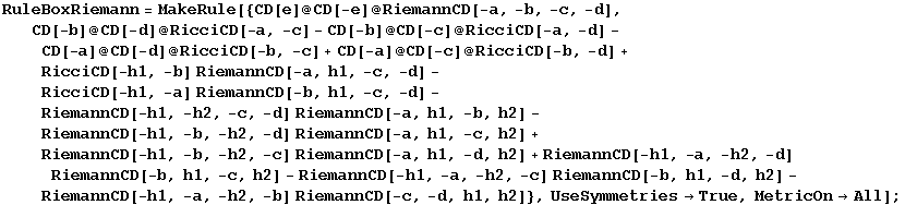 The other 32 rules are actual consequences of the cyclic symmetry of the Riemann tensor, and therefore must be programmed independently. Using MakeRule we can avoid typing equivalent rules (up to permutations of indices), reducing the number to 17 independent rules.